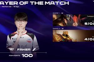体育资讯4月19日讯 在今日的LCK常规赛上,T1以2-0的比分横扫KRX,本场BO3中Faker状态神勇两局一次不死打出9-0-14的战绩!